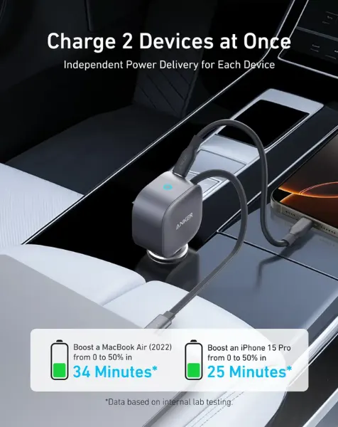 شاحن سيارة قوي من Anker بقدرة 75 واط مع كابل USB-C مدمج قابل للسحب ومنفذ USB-C إضافي، يتيح شحن جهازين في نفس الوقت بسرعة وأمان، بتصميم مدمج وعملي يناسب كل السيارات.