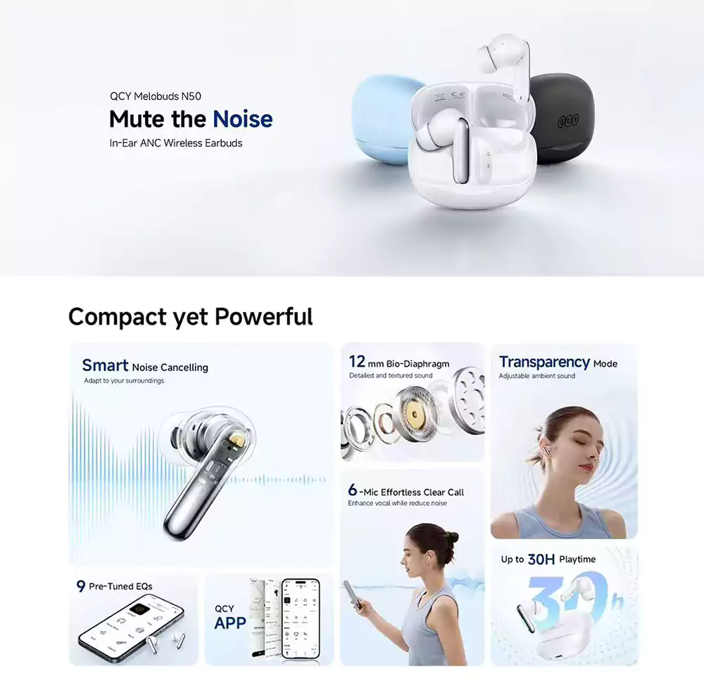 QCY MeloBuds N50 سماعة لاسلكية متطورة بإلغاء ضوضاء نشط حتى 45dB، صوت قوي وواضح، مكالمات نقية بفضل 6 ميكروفونات، بطارية تدوم حتى 28 ساعة، ودعم وضع الشفافية والألعاب، مع مقاومة للمياه IPX5 وتصميم مريح للاستخدام اليومي.